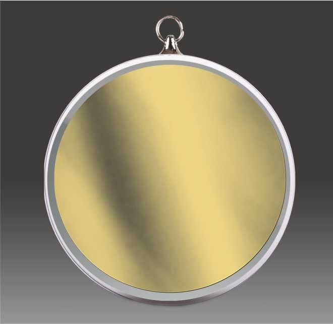 Glass medal with a thickness of 10 mm and a diameter of 70 mm.